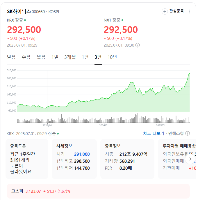 - 사상 최대 실적 기대: HBM 비중 확대와 일반 메모리 시장의 본격적인 회복으로, 2025년 SK하이닉스가 사상 최대 실적을 기록할 것이며, 연간 영업이익이 30조 원 이상에 이를 것이라는 증권사 전망도 나오고 있습니다.