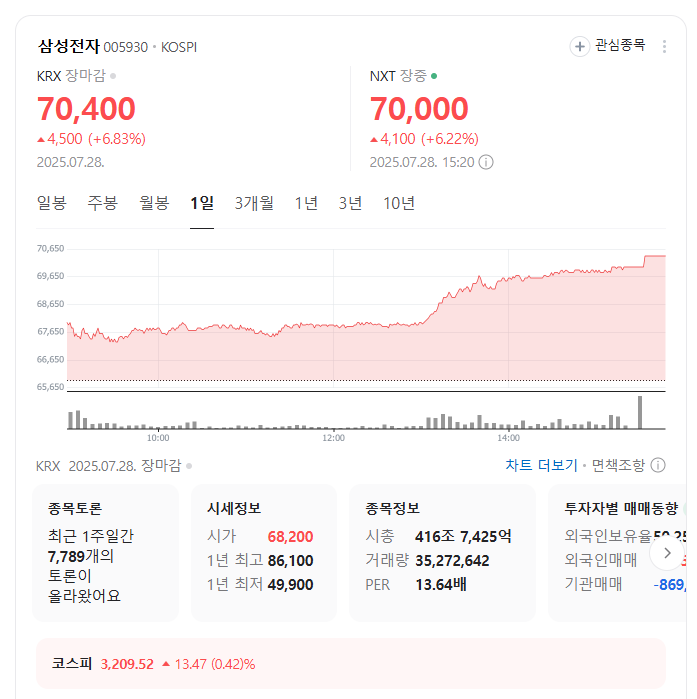 오늘(7월 28일) 주식 시장에서 많은 투자자들의 환호를 이끌어낸 삼성전자의 '7만전자' 회복 소식, 정말 뜨거웠죠!