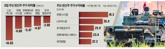 - 가장 큰 이유는 '고평가' 논란입니다. LIG넥스원, 현대로템, 한화시스템 등 국내 방산업체들의 주가순자산비율(PBR) 및 주가수익비율(PER)이 미국 록히드마틴 등 글로벌 1위 방산업체보다 높게 평가되면서, "주가가 지나치게 높은 수준에 도달했다"는 지적이 나왔습니다.